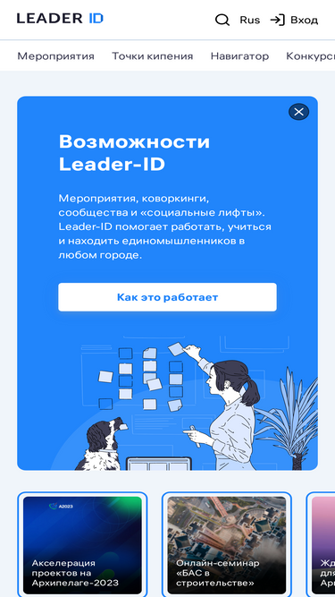 85%Бесплатные мероприятия и коворкинги в вашем городе. Leader-ID помогает работать, учиться и находить единомышленников.