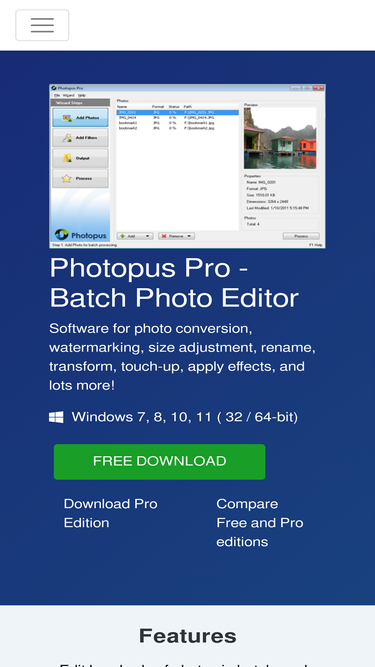 photopus is an easy to use batch photo editor software to convert, add watermarks (text and image), resize, transform, touch-up, rename, and apply effects to hundred of photos in just one go.