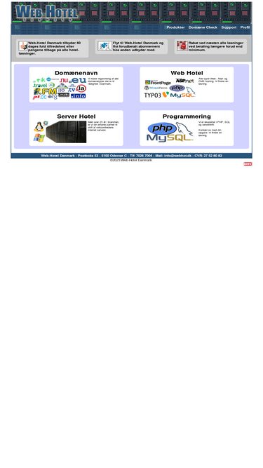 45%web-hotel danmark er et af danmarks ældste web-hoteller. kontakt os, vi finder en løsning. nogle af vores features: webmail/fri trafik/daglig backup/frontpage/asp/asp.net/pop3/imap4/mysql/odbc/realtime statistik/php7/perl5 m.m.