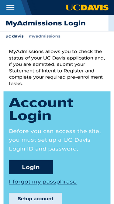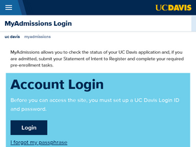 61%myadmissions myadmissions allows you to check the status of your uc davis application and, if you are admitted, submit your statement of intent to register and complete your required pre-enrollment tasks.