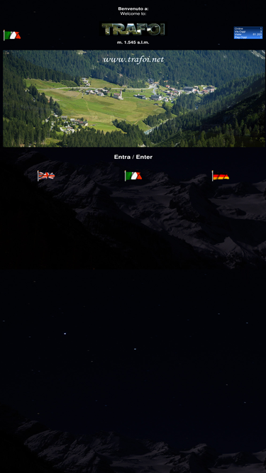 97%questo sito su trafoi, è stato fatto da un amante ed assiduo frequentatore del luogo che dal 1971 vi ha lasciato il cuore. ho cercato di raccogliere tutto quello che si trova in rete; inoltre, è una specie di tam tam per quelli che hanno vissuto esperienze simili alla mia nel cuore del parco nazionale dello stelvio; altro fine è raccogliere tutte le impressioni su quelli che hanno visitato questo paese e dare qualche consiglio a chi vorrà conoscerlo.