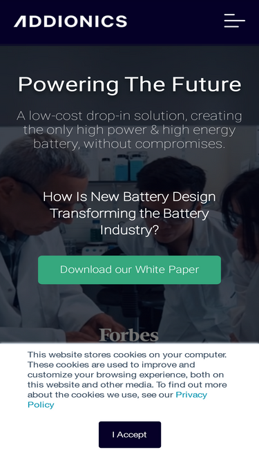 84%Addionics 3D Current Collectors Addionics provides specialized improved rechargeable batteries by redesigning their architecture. Our patent-protected scalable 3D Current Collector manufacturing enhances capacity, safety, charging time, lifetime, and the cost of batteries. Addionics’ novel 3D structure minimizes the internal resistance and improves mechanical longevity, thermal stability and other fundamental limitations and degradation factors in standard […]