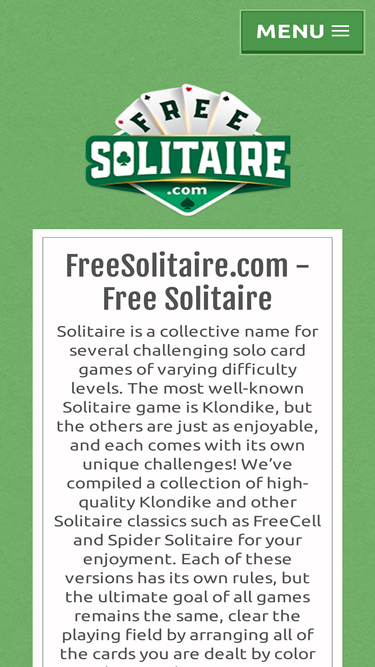 85%Play classic Solitaire games online for free, like Klondike, Spider, and Freecell. Full screen, no download or registration—great fun and a brain boost!