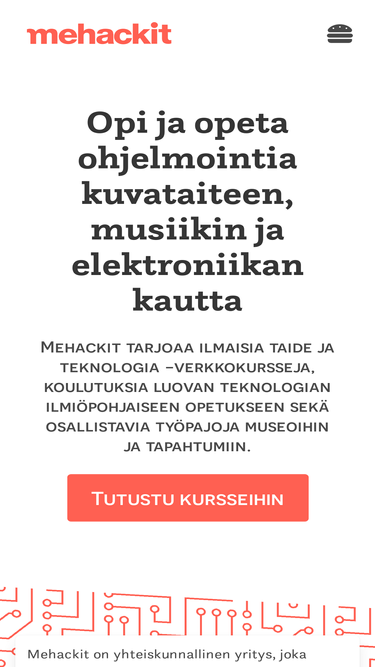 85%Mehackit tarjoaa ilmaisia taide ja teknologia -verkkokursseja, koulutuksia luovan teknologian ilmiöpohjaiseen opetukseen sekä osallistavia työpajoja museoihin ja tapahtumiin.