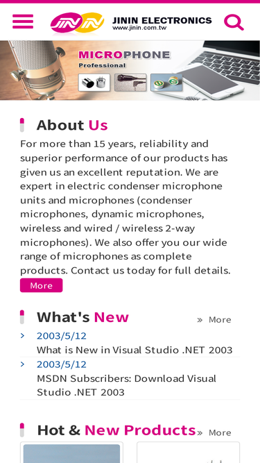 100%jin in electronics co.,ltd. professional manufacturer making electret condenser microphone, em microphone, fm wireless series, two-way radio accessories, wireless handheld microphones, microphone units, hand free microphone, multimedia microphones, 電容式麥克風音頭, 迷你音頭. please contact us for any question about our products.
