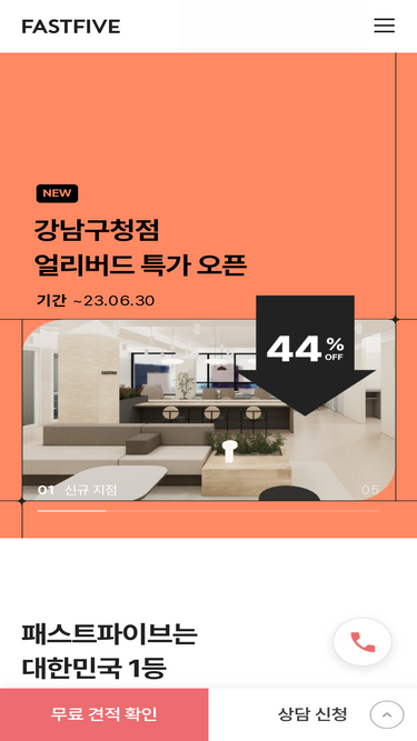 73%대형 공유오피스 비상주사무실 | 사업자반려 100% 환불 | 실사지원 | 우편물관리 | 온라인 결제, 할부지원 | 보증금 Zero, 법인 추가금 Zero | 결제 즉시 앱에서 계약서 다운로드 | 개방형 오피스 및 회의실(4~12인) 유료 옵션 사용 가능