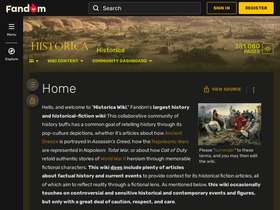 75%Hello, and welcome to "Historica Wiki," Fandom's largest history and historical-fiction wiki! This collaborative community of history buffs has a common goal of retelling history through its pop-culture depictions, whether it's articles about how Ancient Greece is portrayed in Assassin's Creed, how the Napoleonic Wars are represented in Napoleon: Total War, or about how Call of Duty retold authentic stories of World War II heroism through memorable fictional characters. This wiki does...