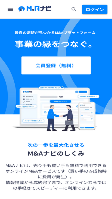 84%中小企業のM&A・事業承継マッチングプラットフォーム「M&Aナビ」を運営する株式会社M&Aナビの公式ホームページです。