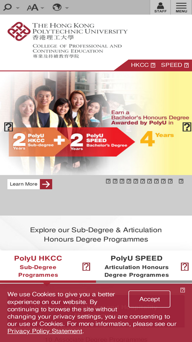 93%The PolyU CPCE Division of Science, Engineering, and Health Studies (SEHS) focuses its scholarly efforts and learning and teaching activities on Health and Life Sciences, Information Technology, Mathematics, Statistics, Engineering, Surveying and Property and Asset Management. Our programmes include Higher Diploma (HD) and Associate Degree (Asso) programmes, as well as full-time and part-time Articulation Honours Degree programmes. Students can earn a PolyU honours degree in four years.