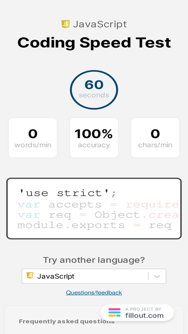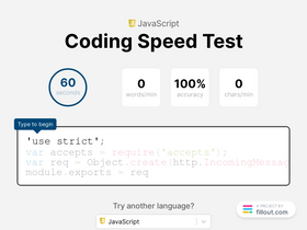 95%Test your coding typing speed in Javascript, Python, C, Java, Go and more. Find out your programming words per minute (WPM) for free, online.