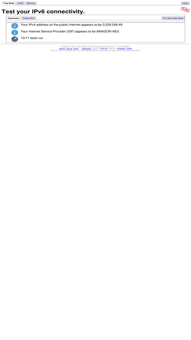 96%ipv6-test.com is a free service that checks your ipv6 and ipv4 connectivity and speed. diagnose connection problems, discover which address(es) you are currently using to browse the internet, and what is your browser's protocol of choice when both v6 and v4 are available.
