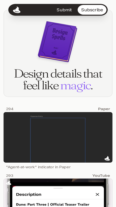 93%An archive of past issues of the Design Spells newsletter — A biweekly newsletter featuring micro-interactions, easter eggs, and other seemingly extra design details that infuse life, personality, and fun back into the web.