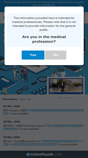 89%e-casebook provides a live video streaming service "e-casebook LIVE" for surgeries and lectures by top level doctors in various fields including Cardiology, Orthopedics, Neurosurgery, Neurology, Gastrointestinal Surgery, Gastroenterology as well as a discussion platform "e-casebook FORUM" for case studies on the web based on DICOM images.