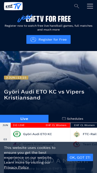 Welcome to EHFTV.com, the official stream platform of the European Handball Federation (EHF). On EHFTV.com, matches from every EHF competition will be available, complemented with highlights, the best goals and saves, as well as plenty of additional content created exclusively for the platform. Geo-blocking restrictions may apply in your region for live broadcasts. Check out EHF’s TV Guide to see where to watch every match. EHFTV.com has been designed to be fully adaptable to all devices, regardless of whether fans are at home or on the go, the best handball action will be accessible any time and from anywhere. Are you ready to enjoy the best handball experience? Register for free on EHFTV.com and you will be able not only to watch games live and on demand, but also to personalize your fan experience during the whole season. Join EHFTV.com and get ready for a new handball era!