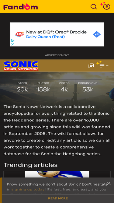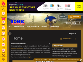 88%The Sonic Wiki Zone (formerly, Sonic News Network) is a collaborative encyclopedia for everything related to the Sonic the Hedgehog series. There are over 20,000 articles and growing since this wiki was founded in September 2005. The wiki format allows for anyone to create or edit any article, so we can all work together to create a comprehensive database for the Sonic the Hedgehog series.