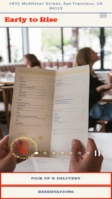 93%Early To Rise is a cozy corner venue with communal seats serving season, scratch made Brunch in San Francisco, CA