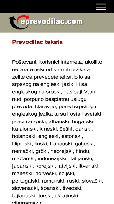 85%dragi prijatelji, ako imate problem kod prevodjenja teksta, naš online prevodilac vam pomaže da besplatno prevedete tekst sa engleskog ili bilo kog stranog jezika na srpski, ili sa srpskog na bilo koji strani jezik i to potpuno besplatn. naravno, pored srpskog i engleskog jezika tu su i ostali svetski jezici (arapski, albanski, bugarski, katalonski, kineski, češki, danski, holandski, engleski, estonski, filipinski, finski, francuski, galješki, nemački, grčki, hebrejski, hindu, mađarski, indonezijski, italijanski, japanski, korejski, latvijski, litvanski, malteški, norveški, šoljski, portugalski, rumunski, ruski, slovački, slovenački, španski, švedski, tajlandski, turski, ukrajinski i vijetnamski).