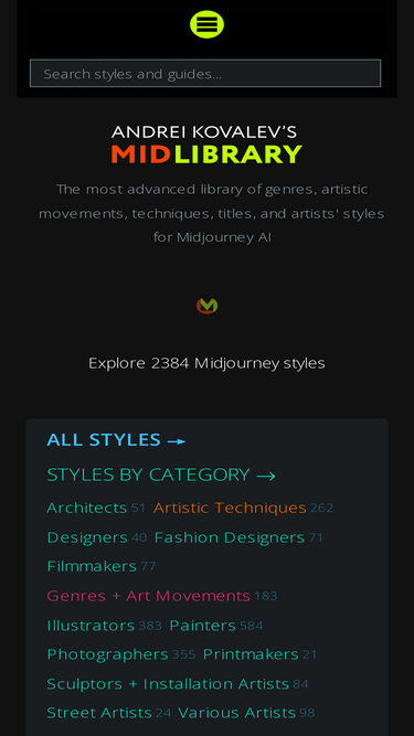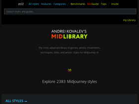 92%The most advanced library of Midjourney AI artistic styles (from V6.1 to niji) and SREF codes. Midjourney Guides + Tools for Midjourney workflow