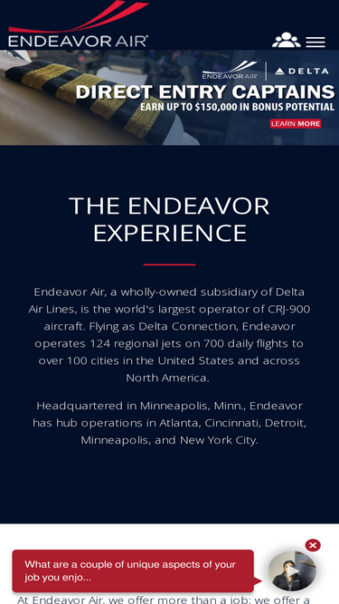 Endeavor Air is a wholly-owned subsidiary of Delta Air Lines. As a regional airline operating as Delta Connection, Endeavor flies the world's largest fleet of CRJ-900 aircraft to more than 134 cities across North America.