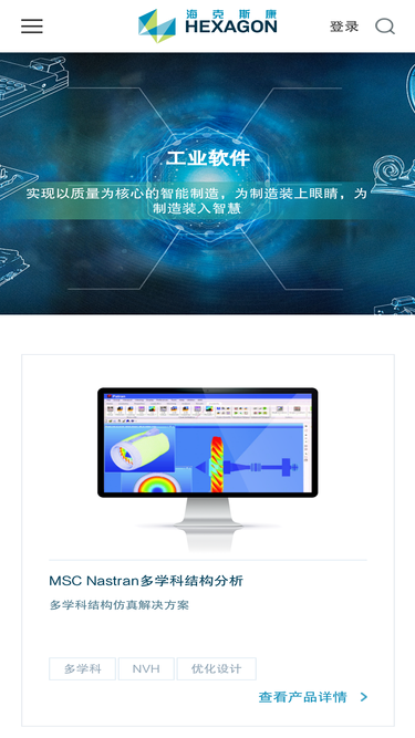 61%海克斯康工业软件(msc软件公司)是全球cae仿真软件及cae解决方案领域专家,位居世界前列的各大生产厂商都使用msc软件公司的工程仿真技术,进行线性和非线性的有限元分析(fea)、声学、流固耦合、多物理场、优化、耐久性、多体动力学以及控制系统的仿真模拟,产品包括patran、adams、marc、dytran、 fatigue、simxpert、simdesigner、simmanager、easy5、sinda和actran等。本网站包含了msc产品介绍及案例,并提供了丰富\全面\专业的cae培训课程以及cae技术服务.