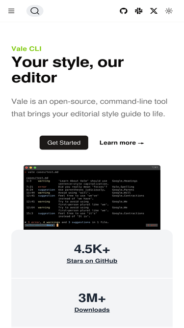 94%Vale is a command-line tool that brings code-like linting to prose. Vale is cross-platform (Windows, macOS, and Linux), written in Go, and available on GitHub.