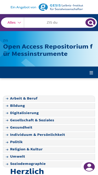 82%zis ist ein open access repositorium für sozial- und verhaltenswissenschaftliche erhebungsinstrumente (fragebogen, tests, items, skala, index) von gesis – leibniz-institut für sozialwissenschaften. dokumentiert sind instrumente zu verschiedenen themen in den sozialwissenschaften wie arbeit und beruf, gesundheit oder politik. beispielsweise sind kurzskalen zur erfassung psychologischer merkmale (persönlichkeit) und instrumente zur erfassung von politischen oder umweltbezogenen einstellungen verfügbar. die instrumente sind nach einheitlichen wissenschaftlichen qualitätsstandards (ratswd) begutachtet, dokumentiert und bewertet. alle dokumentierten instrumente sind kostenfrei für nicht kommerzielle forschungszwecke einsetzbar.