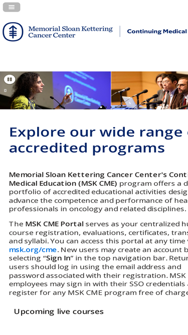 memorial sloan kettering continuing medical education, memorial sloan kettering cancer center — the world’s oldest and largest private cancer center — has devoted more than 130 years to exceptional patient care, innovative research, and outstanding educational programs. today, we are one of 50 national cancer institute–designated comprehensive cancer centers, with state-of-the-art science flourishing side by side with clinical studies and treatment. about msk cme the goal of memorial sloan kettering's continuing medical education (msk cme) program is to disseminate current and new knowledge of the etiology, prevention, diagnosis and treatment of cancer, and allied diseases in order to improve competence. the offerings are also intended to enhance the training of physicians and other healthcare professionals. the content of the activities is designed to include new research findings, clinical knowledge, and treatment modalities and their applications to various types and stages of cancer and allied diseases.the target audience of the msk cme program includes attending physicians, oncologists, multidisciplinary practice teams, physicians in the memorial sloan kettering cancer center regional networks and off-site facilities, and other scientists, nurses and allied healthcare professionals. msk cme activities the msk cme program sponsors a range of activities including live courses directed primarily at non-staff physicians, which may offer hands-on skill training, and regularly scheduled conferences directed to specific groups of specialists on the memorial sloan kettering (msk) staff, and offered to the msk regional networks through video-conferencing technology. also recognized as methods of providing the community of practicing physicians with information in a practical, expeditious and productive manner are enduring materials and internet/web-based programs and publications. the expected results are the enhancement of professional knowledge with the