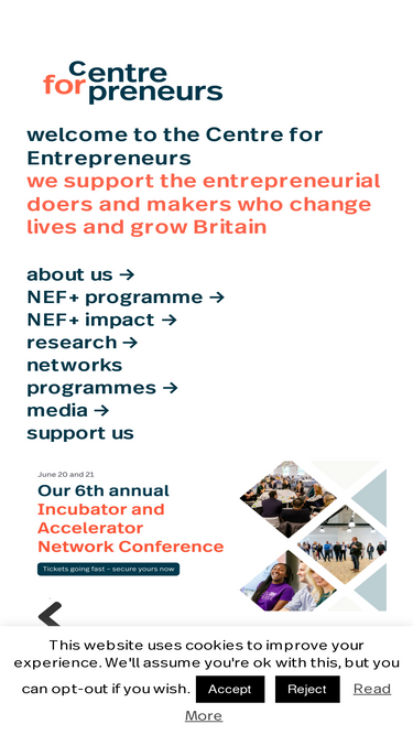 100%The Centre for Entrepreneurs is a UK registered charity that supports the entrepreneurial doers and makers who change lives and grow Britain.
