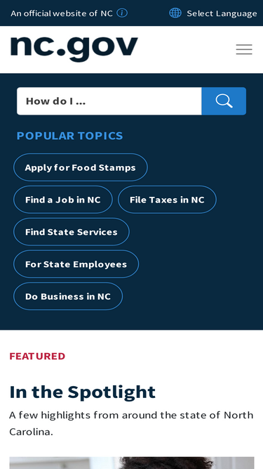 100%North Carolina's Official Website, featuring information about government services, updates, and guides to exploring and enjoying our state.