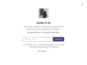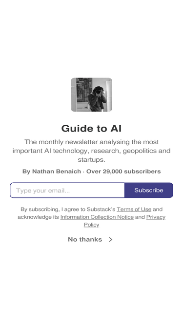 100%the monthly newsletter analysing the most important ai technology, research, geopolitics and startups. click to read guide to ai, by nathan benaich, a substack publication with tens of thousands of subscribers.