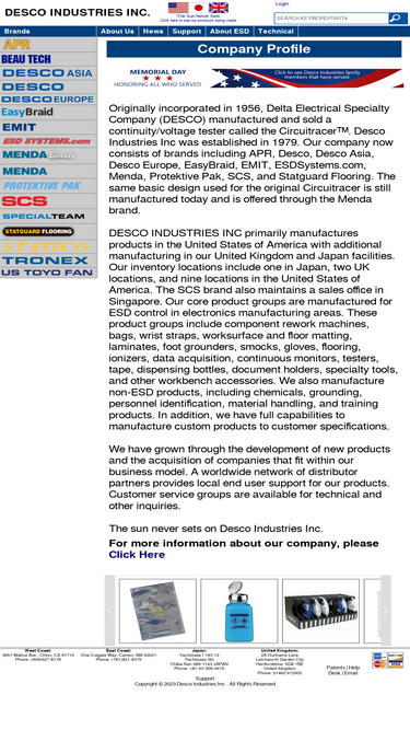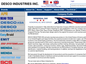 89%Originally incorporated in 1956, Delta Electrical Specialty Company (DESCO) manufactured and sold a continuity/voltage tester called the Circuitracer™. Desco Industries Inc was established in 1979. Our company now consists of brands including APR, Desco, Desco Asia, Desco Europe, EasyBraid, EMIT, ...