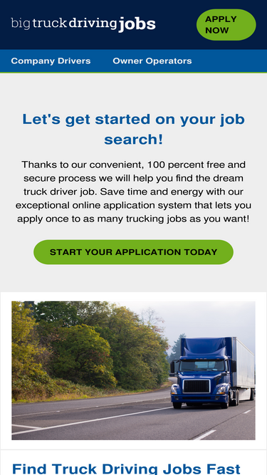 74%Thanks to our convenient, 100 percent free and secure process we will help you find the dream truck driver job. Save time and energy with our exceptional online application system that lets you apply once to as many trucking jobs as you want!
