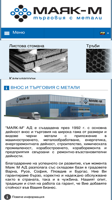 100%компанията маяк м ад е създадена през 1992г. с основна дейност внос и търговия на широка гама от размери и видове черни метали с приложение в машиностроенето, металообработване, енергетика, енергоремонтната дейност, строителство, химическата промишленост, корабостроенето, кораборемонта и предприятия свързани с ремонтно-възстановителни дейности
