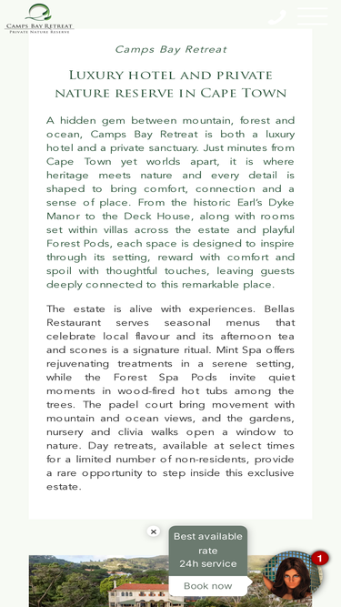 87%A hidden gem in Camps Bay, Cape Town. Private hotel and nature retreat with villas, spa, padel and dining. Inspire · Reward · Spoil.