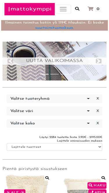 On ostoslistallasi sitten nukkamatto, iso matto, pyöreä matto, valkoinen matto tai vaikka lastenhuoneen matto, löydät Sotkasta edullisesti matot kodin kaikkiin tiloihin. Kokoja löytyy laidasta laitaan, on kyseessä sitten käytävämatto tai olohuoneen matto.