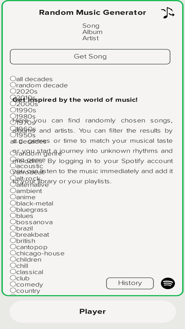 97%Discover random songs from all of Spotify music with our Random Songs Generator.