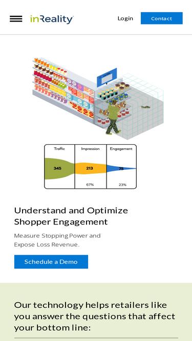 Understand and Optimize Shopper Engagement Measure Stopping Power and Expose Loss Revenue. Schedule a Demo https://www.inreality.com/wp-content/uploads/2023/02/Home_Page_Banner_Animation.mp4 Our technology helps retailers like you answer the questions that affect your bottom line: Are people engaging with my product displays? Do those product engagements lead to sales? How do I use those engagement insights to optimize my shopper
