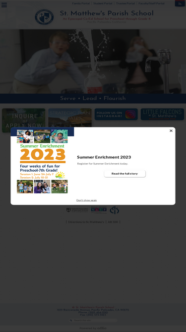 st. matthew’s parish school, a preschool through 8th grade episcopal day co-ed school, is an integral part of the parish of st. matthew, serving children and families of the parish and larger community. the school provides an excellent education through a challenging, caring and balanced program. our purpose is to affirm that we are all children of god and to nurture intellectual, creative, spiritual and ethical individuals who serve, lead and flourish in an ever-changing world.some of our programs include the following: summer session, after school enrichment, after school sports, maker space, project based learning, east coast trip, theatre, arts, maker space, age-appropriate technology with additional auxiliary programs such as parent tot, mommy and me, toddler bridge, parent toddler. families are from westside los angeles, pacific palisades, brentwood, santa monica, malibu, venice and afar. we are an independent school, a private school for preschool, pre-k, k-8, or elementary and middle school in west los angeles.
