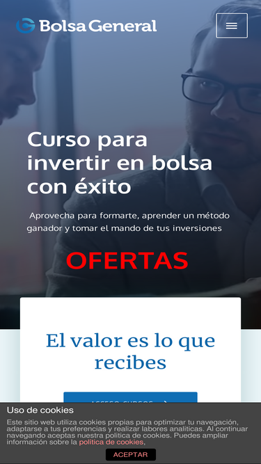85%Le presentamos la oferta para adquirir el “Curso para aprender a invertir con éxito” de Bolsa General donde podrá aprender desde 0 y poco a poco los conceptos básicos de bolsa hasta adentrarse en gestión de capital, psicología del trading, chartismo, análisis cuantitativo, método Fibonnacci… Además tendrá acceso durante una semana al centro de traders. Aproveche para formarse y tomar el mando de sus inversiones. Los cursos se imparten mediante una completa plataforma online y en él explicaremos como invertir en bolsa utilizando el Análisis Técnico de forma profesional y venciendo el componente psicológico. Recibirá 4 meses de acceso al curso para invertir con éxito( es ampliable en caso de necesitarlo) impartido por los analistas de amplia y dilatada experiencia y del prestigio de David Galán y Albert Albareda. Aprenda de los mejores pero a un buen precio y de una forma práctica desde nivel inicial, con numerosos vídeos explicativos. El curso está pensado para personas sin conocimiento de bolsa así como para profesionales de banca, gestores de patrimonios, docentes, graduados universitarios e inversores no profesionales que estén interesados en adquirir conocimientos profesionales en la utilización del análisis técnico. No pierda tiempo e inscríbase en los mejores cursos online de bolsa. Los cursos cuentan con más de 25 vídeos explicativos y ejercicios relacionados con la teoría, que junto a un foro de tutoría abierto las 24 horas, hacen que su carácter didáctico y de interacción con los alumnos sea total. Para descargar el índice del curso para invertir con éxito pincha sobre el siguiente archivo: ÍNDICE Si está interesado en adquirir la oferta tan solo tiene que añadir el producto al carro de la compra.
