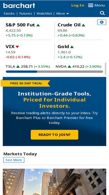79%Barchart.com Inc. is the leading provider of real-time or delayed intraday stock and commodities charts and quotes. Keep tabs on your portfolio, search for stocks, commodities, or mutual funds with screeners, customizable chart indicators and technical analysis.