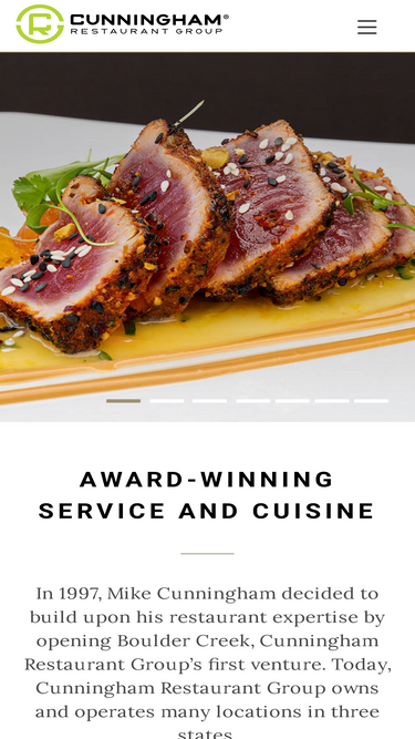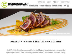 91%Cunningham Restaurant Group opened its first restaurant, Boulder Creek, in 1997 when Mike Cunningham decided to take the lessons learned from his successful restaurant career to his own venture.