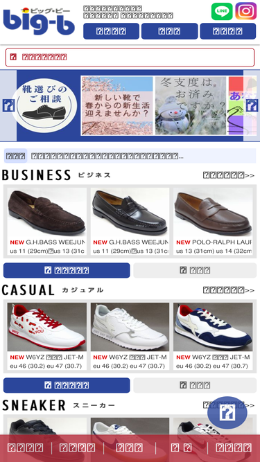 89%東京・五反田駅徒歩2分。上野店は上野駅徒歩2分。ビッグビーは男の大きなサイズの靴の専門店。店頭販売と通販を行ってます。革靴は27cm~36cm、スニーカーは29cm~38cmまで国産品も輸入品も、幅広甲高の靴も多数ご用意しています。また、靴に関するお悩みには熟知したスタッフがお答えします。