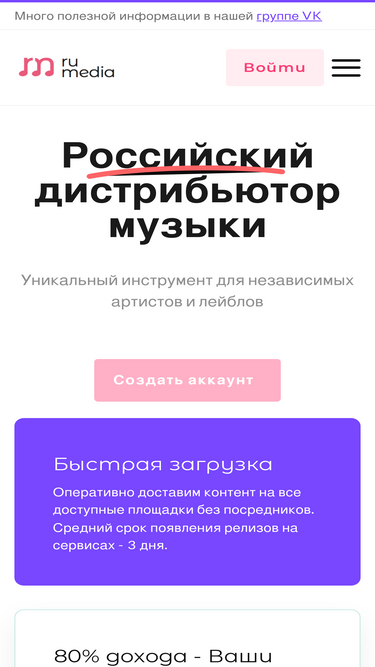 85%Бесплатный сервис дистрибуции музыки для артистов. Зарегистрируйся и получай доход со своей музыки на прозрачных условиях.