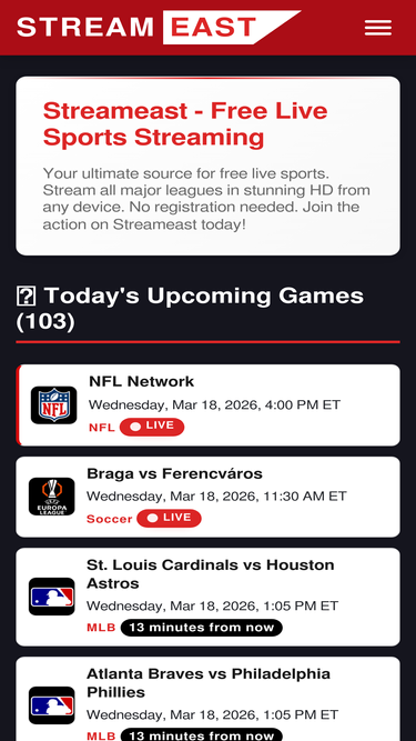 72%StreamEast delivers free HD live sports. Watch NBA, NFL, NHL, MLB, UFC, Soccer, MMA, and football streams online — no sign-up required Just watch every streams in HD for free.