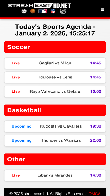100%Catch live streams of soccer, football, NHL, NFL, NBA, tennis, and WWE matches on StreamEast TV. Stay updated with today's sports schedule!