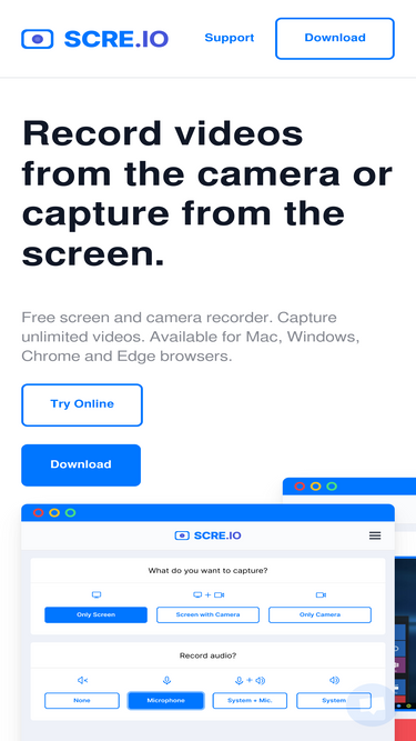 56%Record videos from the camera or capture from the screen. Free screen and camera recorder. Capture unlimited videos. Available for Mac, Windows, Chrome and Edge browsers.