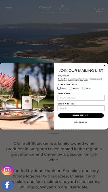 100%welcome to clairault | streicker wines. we produce award-winning, premium and ultra-premium wines in the margaret river region of western australia.we would love to introduce you to our wines in person, at our caves road cellar door, or ship wines to you to enjoy at your leisure, through our online shopping experience. you can learn more about us, our passion for winemaking, sustainability, and the terroir of the margaret river region by taking a tour through our site. yada, yada, yada, enjoy!