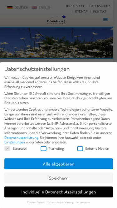 100%futurepace consulting ist ein renommiertes beratungsunternehmen für management consulting und personalentwicklung mit sitz in der schweiz und in deutschland. wir bieten trainings und coaching zu leadership, sales und teamentwicklung sowie telefontrainings und kommunikationstrainings. ausserdem führen wir coaching-ausbildungen für führungskräfte und für spezielle einsatzbereiche (call center coaching-ausbildung) durch. zertifizierungen: management 3.0, insights mdi, moa (meaningful occupation assessment). ausserdem sind wir spezialisiert auf projekte zur strategischen neukunden-akquisition und zu service trainings bzw. marken-trainings ('mitarbeiter zu markenbotschafter', 'brand to action'). zu unseren kunden gehören swiss international airlines, die bmw group, axa assistance, der adac, siemens uvm.