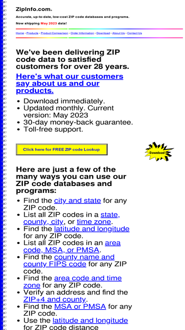 59%accurate and up-to-date zip code databases and programs with zip code related information such as area code, county, latitude, longitude, msa, pmsa, fips code, time zone, and place fips. zip code data available for immediate download. all zip code databases and programs are updated every month.
