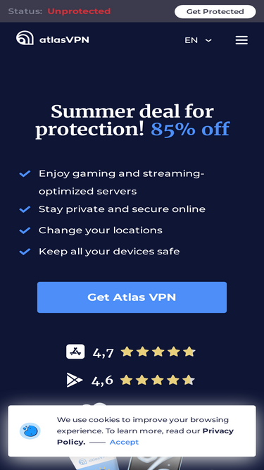 Atlas VPN is an app that ensures private browsing online by changing your IP address and encrypting your connections.